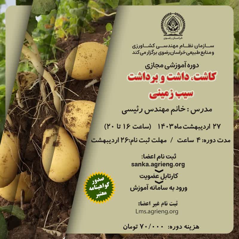 دوره آموزشی مجازی: کاشت ،داشت و برداشت سیب زمینی مدرس: خانم مهندس رئیسی زمان برگزاری: 27 اردیبهشت ماه هزینه دوره: 70/000 تومان